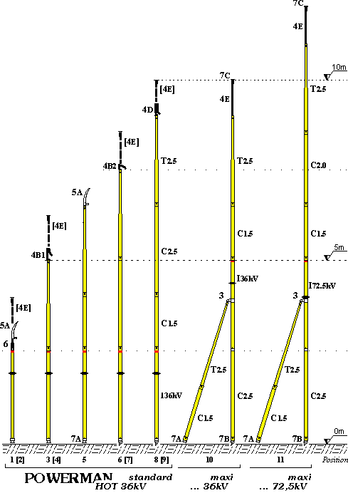 SET-UPS OF KITS Powerman Hot 36 kV - standard Optimum set-up for de-icing and tree pruning in heights up to 10m above terrain, equipped for standard icing events. Powerman Hot 36 kV - maxi As the standard kit, but additionally supplied with a control pole and a full set of tools. Therefore the kit is well equipped also for tough tasks under difficult conditions. Powerman Hot 72.5 kV - maxi All-purpose for work in heights up to 12m above ground. Standardly supplied with a control pole and a full set of tools. Custom kits We will be pleased to offer you kits that will be equipped to meet your specific needs concerning maximum working height, set-up of tools and/or kits for higher rated voltages (e.g. up to 123 kV) etc. Please, do not hesitate to contact us with your requirements. Examples of Assemblies ![]() |